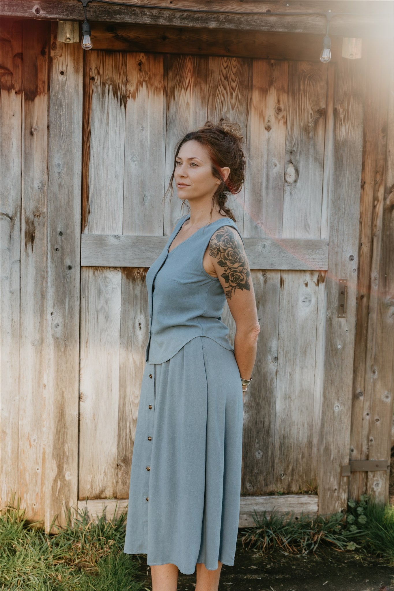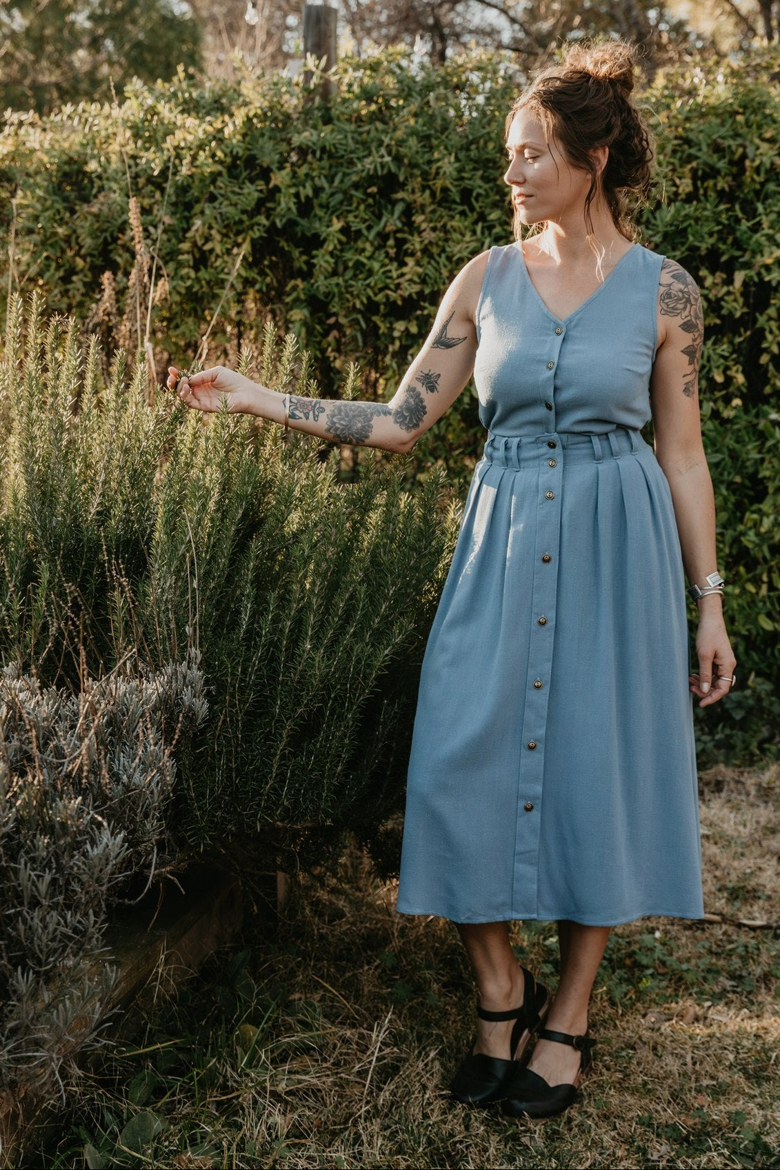 Made from a midweight Linen / Rayon blend with a textured weave.  The Fabric feels soft and yummy and gets better and better with each wash.