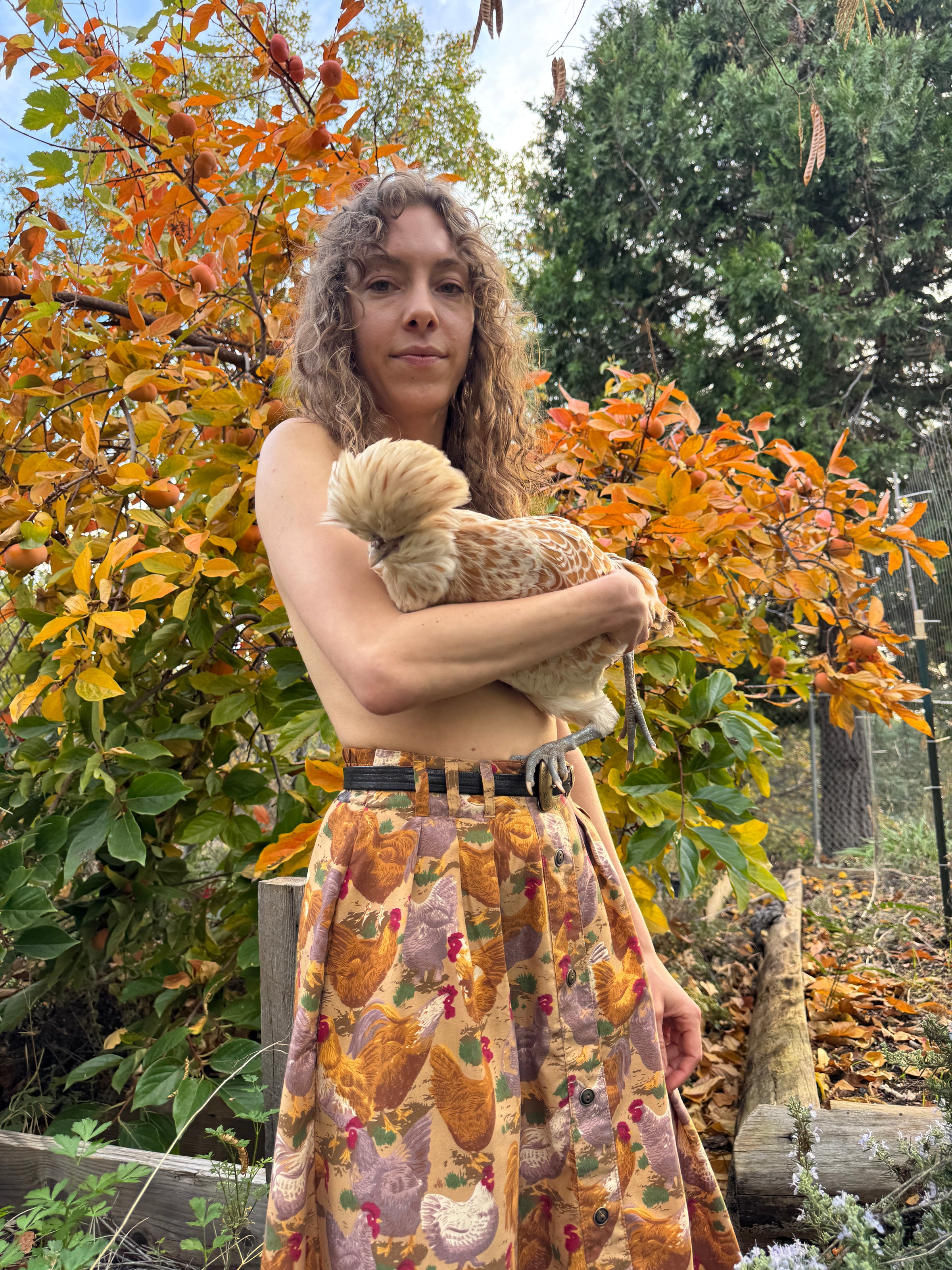 Made from a lightweight deadstock cotton fabric with chicken print.